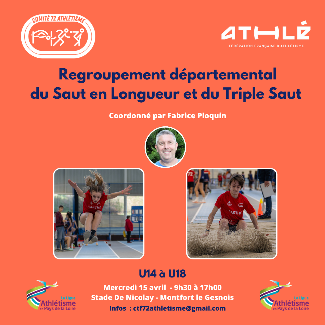 Mercredi 15 avril, Fabrice Ploquin, référent régional du saut en longueur et du triple saut, interviendra à Montfort le Gesnois de 09h30 à 17h00 avec les catégories U14-U16-U18. Les entraîneurs, les assistants coachs et toutes les personnes intéressées sont les bienvenues pour venir observer et partager avec Fabrice qui répondra à toutes vos questions avec grand plaisir.