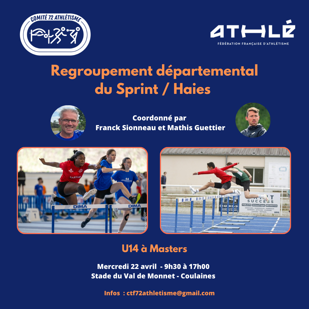 Mercredi 22 avril, Franck Sionneau, entraîneur sarthois de l'équipe technique régionale interviendra à Coulaines sur le thème du Sprint/Haies de 09h30 à 17h00, pour les catégories U14-U16-U18. Nous invitons vivement les entraîneurs, les assistants coachs et toutes les personnes intéressées pour venir observer les contenus de séances qui peuvent être transversaux à toutes les disciplines athlétiques.